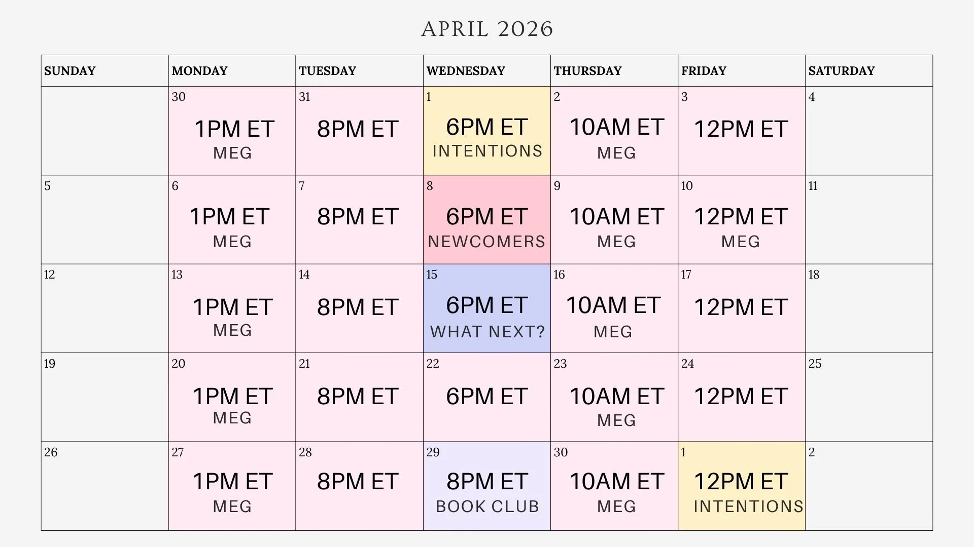 In this meeting, you’ll have a chance to create connections with other new members (and with me!) as you integrate into the group. This is a chance for me to get to know you better and meet you where you’re at on your journey.